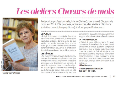 Marie-Claire Culcer était interviewée dans le numéro d'octobre pour parler des ateliers et stages d'écriture créative et autobiographique qu'elle anime sur Saint-Quentin-en-Yvelines.